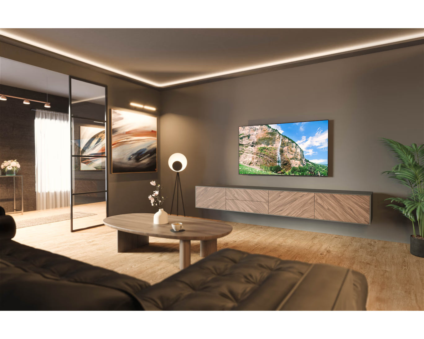 An ultra-thin profile and nearly bezel-less screen create a sleek, modern look that blends seamlessly into any room.